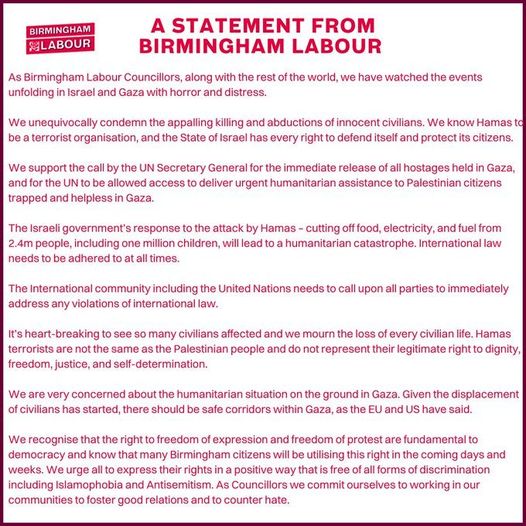 Our statement as the Labour group of Councillors in Birmingham in relation to the unfolding events in Israel and Gaza.
